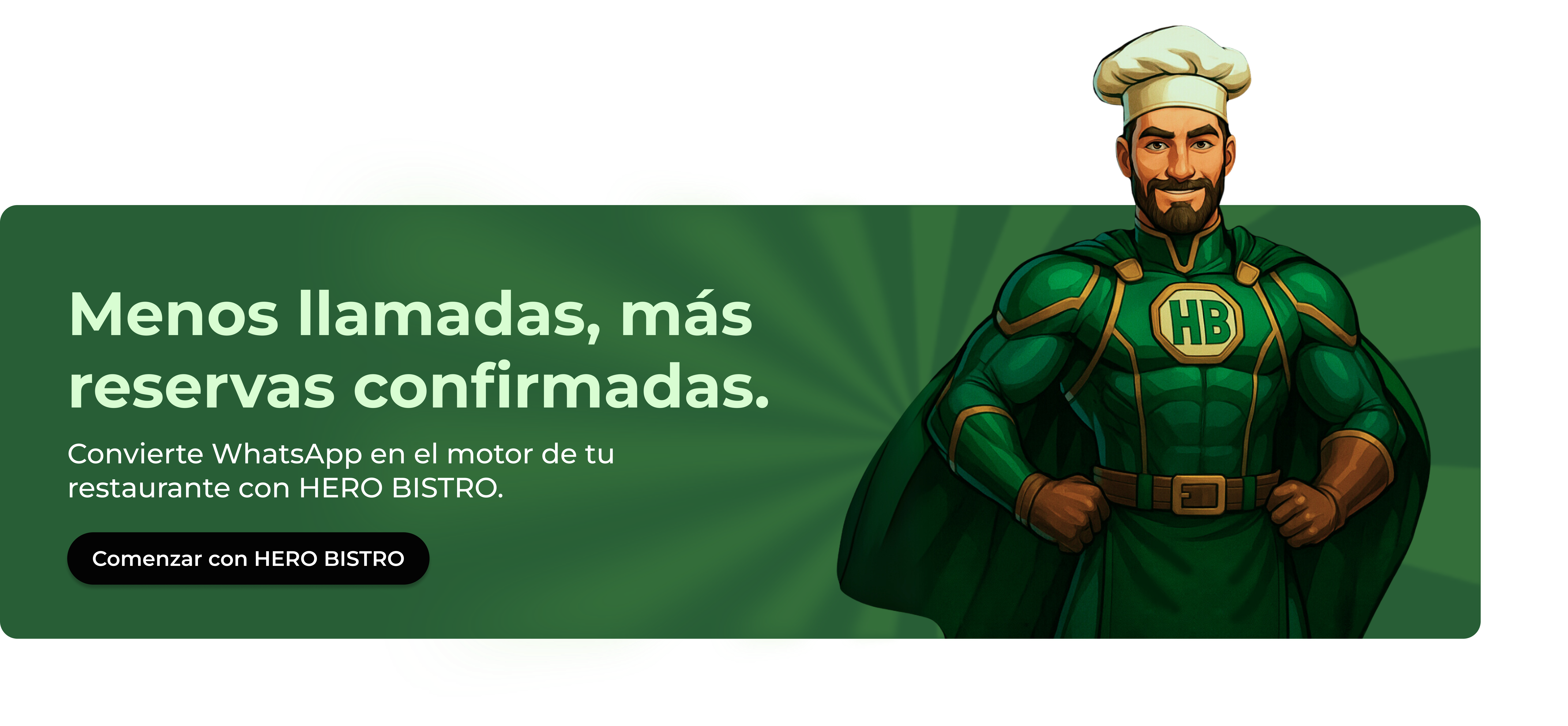 HERO BISTRO va más allá de un chatbot: entiende tus necesidades, responde dudas y te ayuda a atender reservas, pedidos y clientes de forma sencilla, rápida y personalizada.
